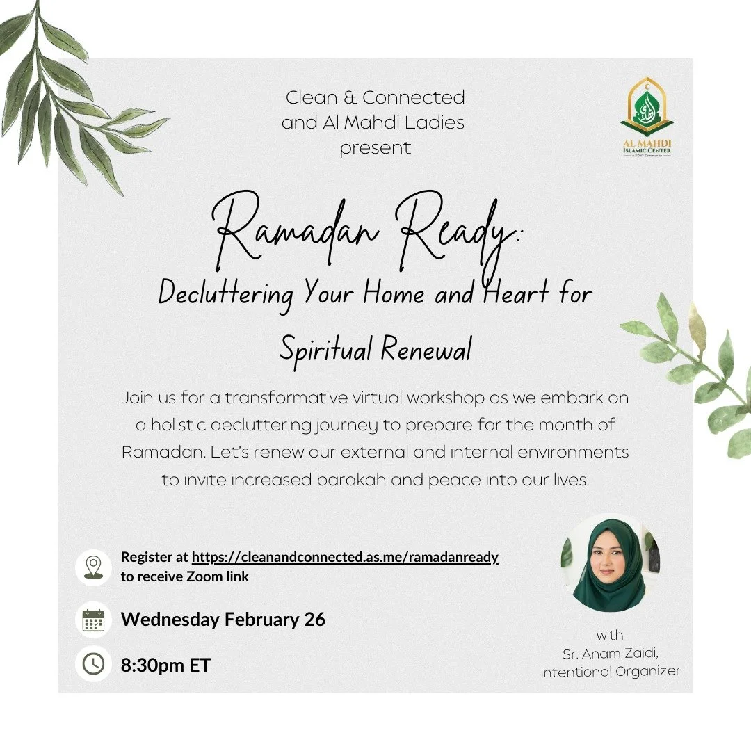 Are you ready to truly prepare for the blessed month of Ramadan? Clean & Connected, in collaboration with Al Mahdi Islamic Center (NY), invites you to a transformative virtual workshop designed to help you declutter both your physical space and your heart, inviting barakah (blessings) and peace into your life this Ramadan.
